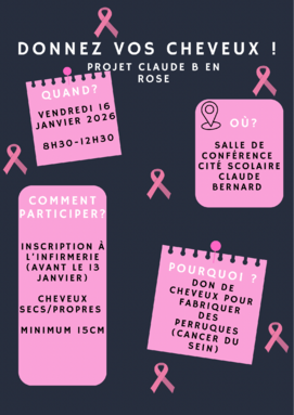 Par CHRISTELE MANIGAND, publié le lundi 15 décembre 2025 11:32 - Mis à jour le lundi 15 décembre 2025 11:36La cité scolaire Claude Bernard s'engage dans la lutte contre le cancer du sein à travers une action solidaire de don de cheveux! Tous de mèche! -