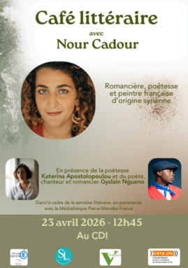 Les BP Libraires vous invitent à venir rencontrer la poétesse Nour Cadour le jeudi 23 avril à 12 h45 au CDI