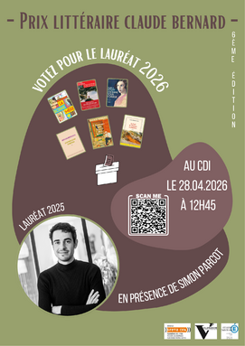 Prix littéraire Claude Bernard, bientôt le lauréat 2026 ! Rendez-vous le mardi 28 avril à 12h45 au CDI